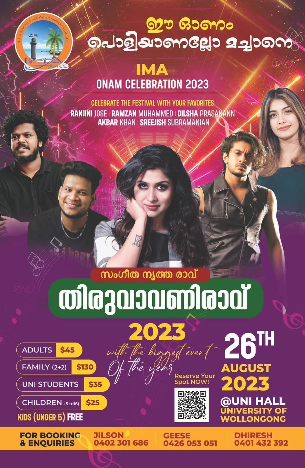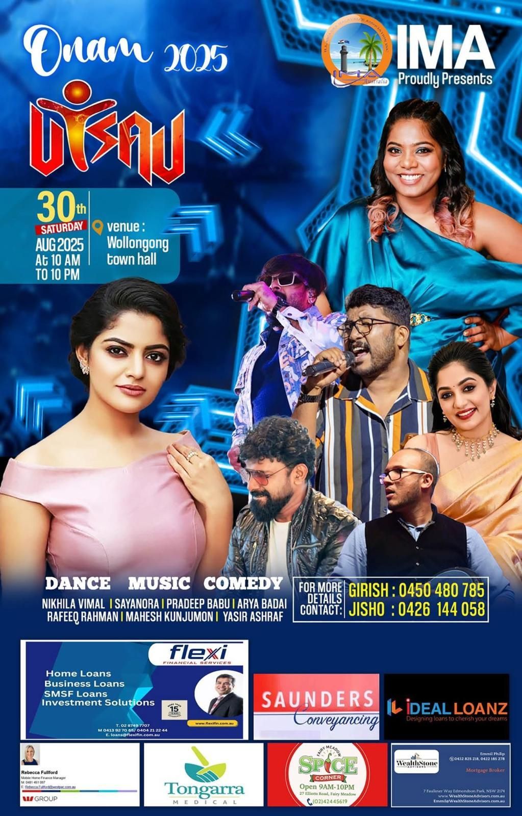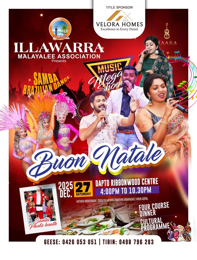 IMA – The Illawarra region’s first and only trusted organisation, bringing together all Malayalees and their families. The Illawara Malayalee Association (IMA) is one of the longest-standing Malayalee organisations in the region, proudly carrying over 12 years of legacy and community spirit. Known for hosting vibrant events and programs, IMA brings renowned artists and talented singers from India to celebrate and share the rich cultural heritage of Kerala.